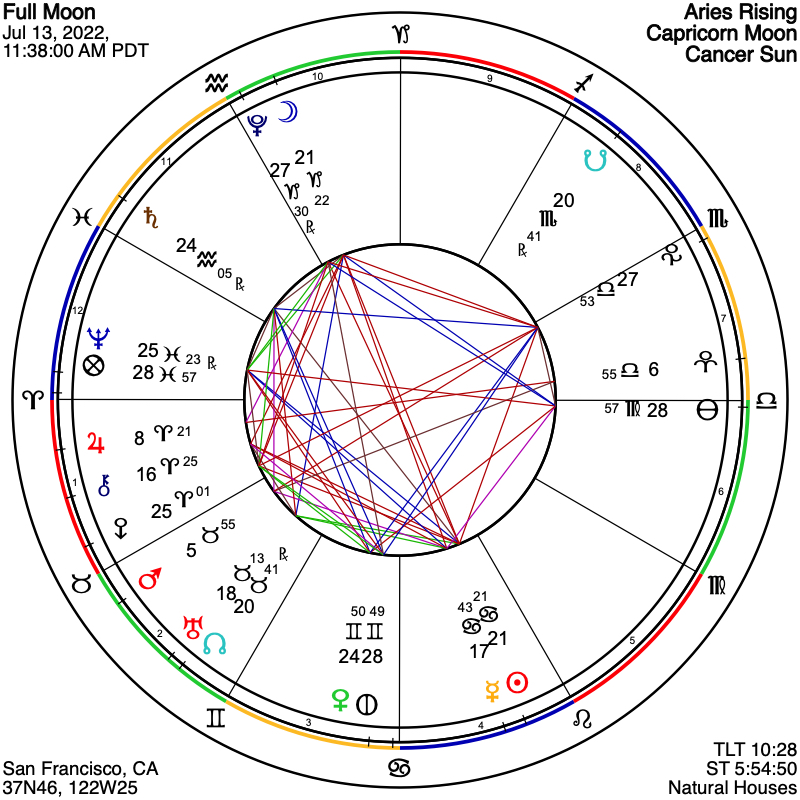 The Full Moon of Wednesday, July 13th, taking place at 11:38 am, PT, later in the day for points east, involves outer planet connections that are redolent of evolutionally change on both individual and collective levels. This is because, at 21 Capricorn, the Moon is widely conjunct transformational Pluto, plus being semi-sextile Saturn, sextile Neptune, and square Eris, which is in aspect to all three of these outer planet archetypes. Mercury is also conjunct the Sun and in close sextile to Trickster Uranus. Just as Pluto, Uranus, and Saturn were featured in the volatile 1960s, so too are they prominent now in this Full Moon, along with idealistic Neptune. We are currently entered into a period of rapid cultural change, as radically conservative elements within the global society vie with a progressive backlash against them.