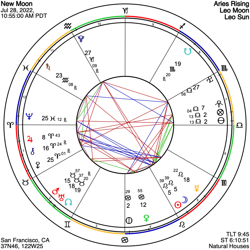 This conjunction between Uranus, the North Node, and Mars alluded to above is one of the most notable transits of 2022. This conjunction is at 18º Taurus and reaches its perfection on August 1st, but its influence is already well in effect during the New Moon. Mercury and Saturn are also activating this configuration in the New Moon chart, where we find Mercury exactly square to this triple conjunction at 18º Leo, with Saturn more loosely in opposition. All together this forms a cardinal cross between the triple conjunction in Taurus, the opposing South Node in Scorpio, and square Mercury in Leo opposite Saturn in Aquarius.