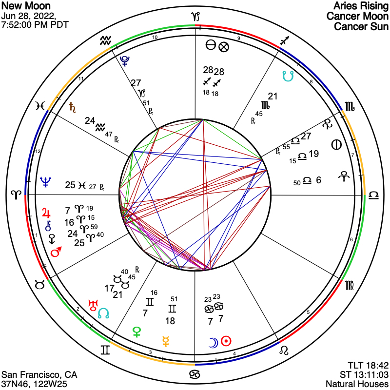 The Cancer New Moon that commences its lunation cycle on June 28th, at 7:52 pm Pacific Time, has some intensely harsh notes, and yet also cause for optimism. While certain aspects of this New Moon, notably Mars, Pluto, and Lilith, may have us bristling against threat and yearning to stand up and speak out for what we truly believe, there is also its softer side. Cancer energy brings a tender nurturing of what it cherishes, loves and wants to defend. The cardinal Water sign of Cancer is where in fact the Moon is most at home, offering an energy that we can tune in with in order to feel cosmic love and a sense of feeling divinely protected. It may be important for you now to tune into the full spectrum of this archetype, allowing yourself to rest in safe spaces to process and tonify your emotional experience, as well as finding your footing in fiercely protecting what it is that you truly value. There is much happening in the externals of our world that is difficult and downright scary, and the astrology is reflective of these facets of our collective experience. However, we can also strive to find a focus upon the psychological and inner experience of how the energy of this New Moon can be framed positively and worked with.