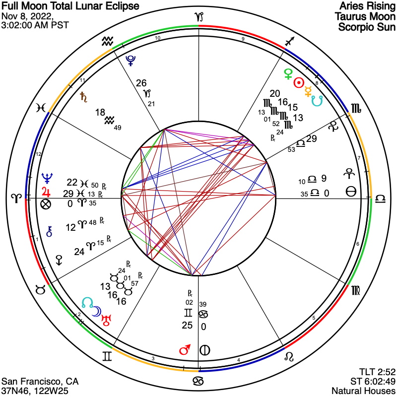 Tuesday morning’s Full Moon eclipse, taking place on November 8th and coincident with Election Day in the U.S., is quite the super-potent astrological event. That is because as the Sun and Moon oppose on another in a total lunar eclipse – with a blood red Moon where visible – they also conjunct other planetary bodies that hold enormous portent for these difficult times that we are currently living through. The eclipse Moon at 16 + Taurus is in partile or same-degree conjunction with Trickster Uranus, while the eclipse Sun is in extremely close conjunction with Mercury in Scorpio, a phenomenon known as “ Mercury Cazimi” indicating a moment of clarity of thought process. Additionally, the Sun, Mercury, Moon, and Uranus make a tight T-square to limiting and consequential Saturn, sitting at 18 + Aquarius. This square between antithetical elements of progressive and conservative impulses, as represented by Uranus and Saturn, is classic and has been around for a while now, being the significant astrological signature from 2021 and early 2022, and reflecting our current time period’s world-wide political chasm between left and right. We have seen extremes of both sides ever more dominant leading up to this fall timeframe with no end in sight. Since this is such an intense astrological configuration, and because eclipses are known to have long-term effects, the likelihood is that these next few months will also partake of the same contentious politics, as will , in the context of these fractious times that we are living through, our individual evolutionary journeys also.