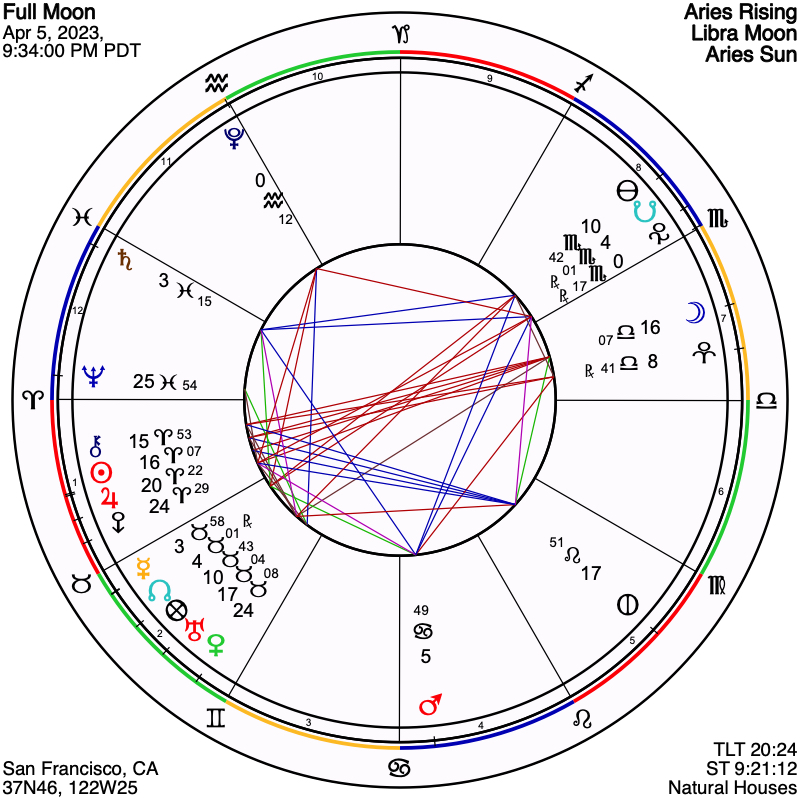 Wednesday’s Libra Full Moon is a volatile one, and takes place on April 5th, at 9:34 PM PT, so early morning the following day for the east coast and Europe. This Full Moon, like the one from the early going of the previous March month, features an alignment to Trickster Uranus indicating both surprises and also the potential for unexpected enlightenment to emerge from that. We can speculate how that fits in with what we are all up to in this early April timing in a moment, but first let’s detail the other significant aspects that we can find and enumerate. The Sun at 16 + Aries is a mere ¼ degree away from Chiron, the Wounded Healer, also located in mid-Aries, and this indicates the potential for our own internal wounding to come up in the mix of events, and with our responses to these events, a possibility that also represents an opportunity. Mars in early Cancer lies in close trine to limiting Saturn, in Pisces, which implies that forward momentum is significantly slowed, a factor that can increase our motivation to look around for some answers to where, indeed, we might be heading on our personal trajectory. Additionally, Mercury closely sextiles Saturn, while Venus, at 24 + Taurus, sextiles flighty and mystical Neptune. By considering new planets recently discovered, there is actually a grand trine in Water right now as well, formed by Mars, Saturn, and Haumea, the new Nature planet, which is sitting at 0 Scorpio in retrograde, and about to enter the last degree of Libra. Also, and quite interestingly, Pluto at 0 Aquarius makes a partile or same-degree square to Haumea.