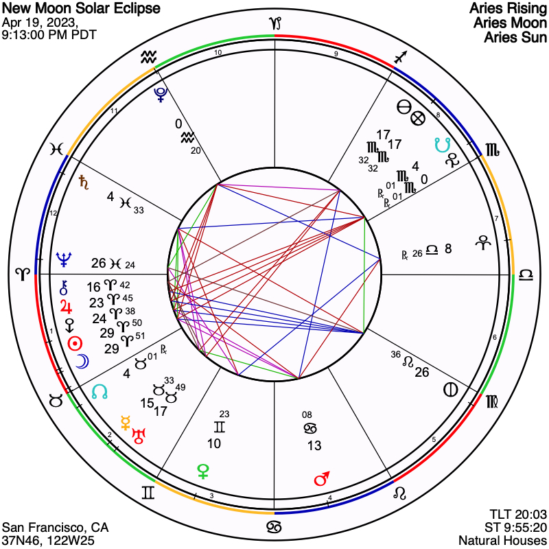 Chiron, the Wounded Healer, at 16 Aries, is also powerfully configured in this eclipse, with the Mercury/Uranus midpoint in precise aspect to Chiron, practically to the minute of a degree. The presence of Chiron as a significant part of the eclipse configuration, makes for another chime with the enormous transformational potential of this week, month, and half year to come. We will want to use discernment with our relationships and our sense of our own identities, along with our feelings of self-worth, remembering that challenges to our peace of mind in these areas are also opportunities for healing long-buried issues.