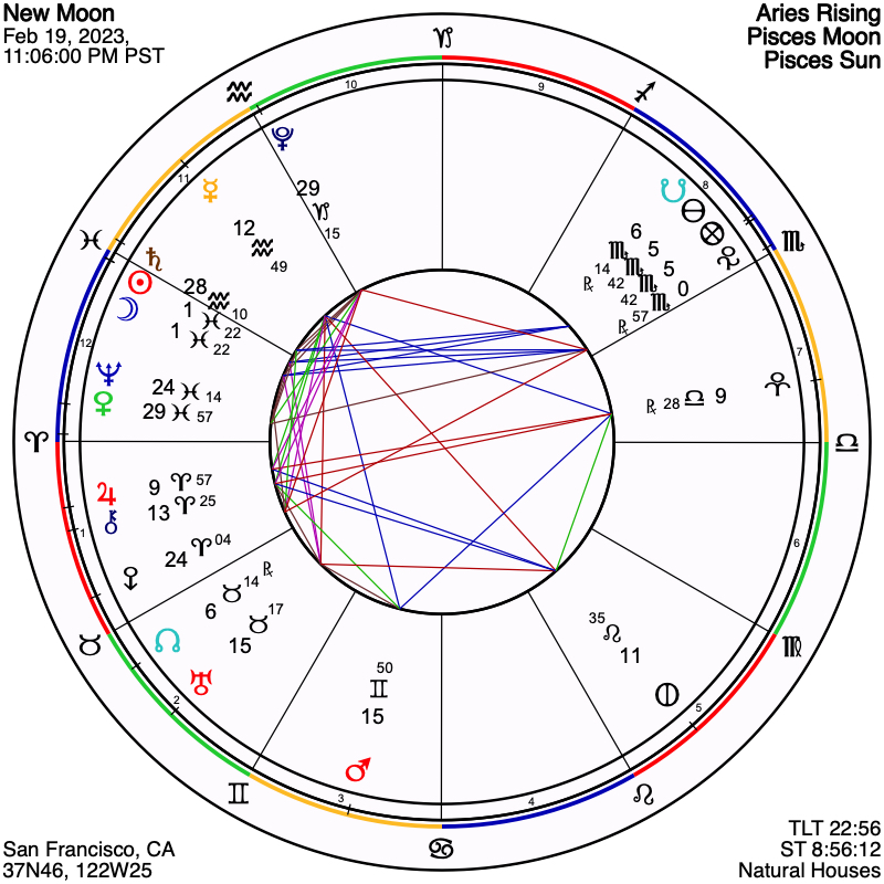Uranus is very prominent in this New Moon configuration, being closely aspected by Mars, Venus, Neptune, and Makemake, as well as being contacted by the Sun and Moon, a 2-degree quintile aspect. His Trickster archetype speaks of surprises, and also of surprise revelations that come to us unbidden, perhaps based on something new either within or outside of our mind. Uranus has also been in the astrological headlines recently, from being triggered by the recent February 5th Full Moon, to being also right on the eclipse degree of the November 8th, 2022, lunar eclipse that accompanied the hotly contested 2022 midterm elections, when the Democrats kept the legislative power base relatively aligned with this country’s more progressive forces.
