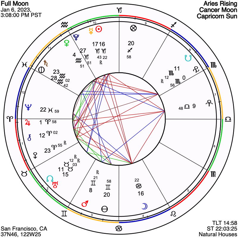 In this January 6th Full Moon also, the Sun trines Uranus in Taurus, suggesting astonishing or sudden events and surprise enlightenment. Uranus was featured in the November 8th eclipse that heralded the progressive mid-term election results then in this country, so we might look for a similar theme as the 2023 year gets underway in the U.S. capital.