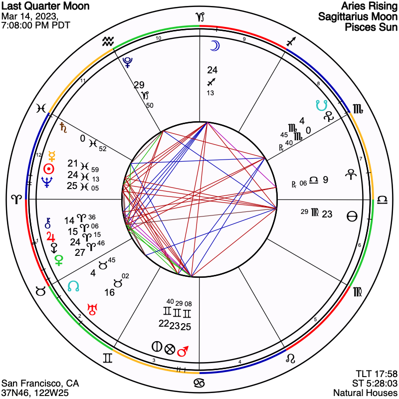 Tuesday evening’s Last Quarter Moon, on 24 Sagittarius, taking place Tuesday, March 14th, at 7:08 PM PDT, later evening for the east coast and early morning the next day for Europe, is a rather powerful lunation! This lunar phase, with the Sun and Moon in square, sees them additionally aligned to within one degree of zodiacal longitude with a perfect Mars-Neptune square, exact almost to the minute, at 25 degrees of their respective signs of Gemini and Pisces. This presages an interesting and fully mystical period of time for the week that follows, leading up to the Aries New Moon of the 21st. Mars energizing Neptune in such a definite manner – as the Mars season of Aries begins to make itself known – leads to at least one good outcome, that we will definitely have the Neptune archetype front and center in our conscious awareness, thereby giving us the opportunity to better understand this numinous archetype of inner Spirit. It is also the case, however, that the energy we have for the completion of our tasks will very likely hit foggy and amorphous road blocks, potentially leading to very different results than we had planned. A strong position of Uranus is also present in this Last Quarter Moon configuration, as has been true through this entire Pisces lunation cycle up to this point, so that unexpected events and surprising revelations are also in the cards for us during its final week.