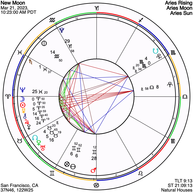 The Aries New Moon comes into exact position on Tuesday, March 21 at 10:23 am PT, later in the day for points east, so less than 24 hours after the Aries Equinox. This potent spring-time lunation bursts energetically on the celestial scene with a wild and vibrant blossoming that can help us to usher in the new astrological year! This New Moon, which marks the new turning of the Sun through the cycle of the zodiac, signals not only liveliness but a strong dose of transformational impulse as well, as we shake off the wintry doldrums of a fractious past and awaken into the vital energy of the new beginning, a spring season of much change in this 2023 year. This New Moon is happening amidst a March month when we are blessed with three significant ingresses – Saturn into Pisces took place on March 7th while Pluto into Aquarius – still to come as this New Moon dawns – happens on March 23rd. Slightly less seismic, but completing an important cycle, we find Mars finally entering Cancer on March 25th, after its extended months-long journey through Gemini. It’s fair to say that the astrological tides are turning dramatically, so that you may be feeling quite a lot falling away as you simultaneously sense a surge of new impulses emerging into your awareness. The details of this New Moon configuration are fascinating for what they may hold for us all.