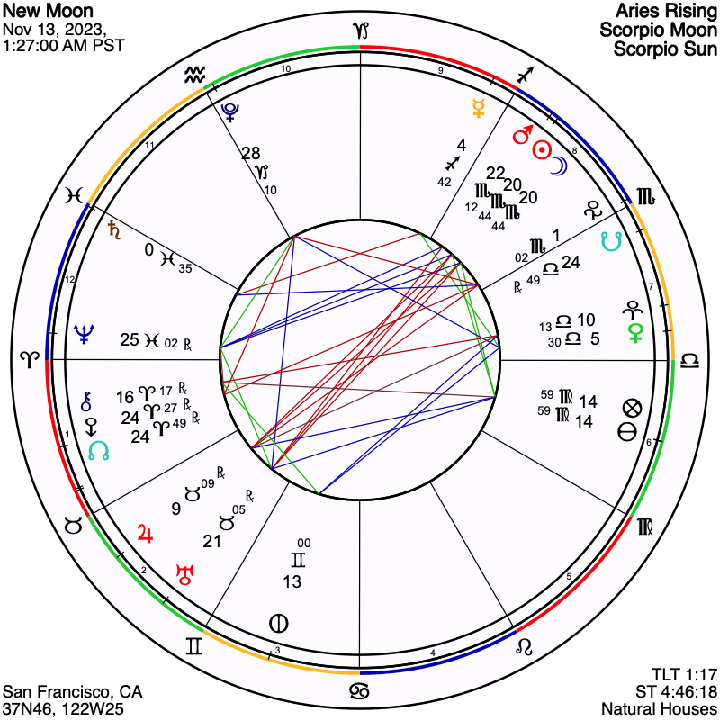 This New Moon and Mars are also inconjunct Eris conjunct the North Node in Aries, bringing to the fore the idea that, as we deal with our tumultuous inner worlds, we benefit by seeking to act in alignment with our deepest values and to avoid endeavors that do not match this criterion. The New Moon in trine with Neptune might also provide a sense of idealism, or possibly confusion, in our dealings with others.