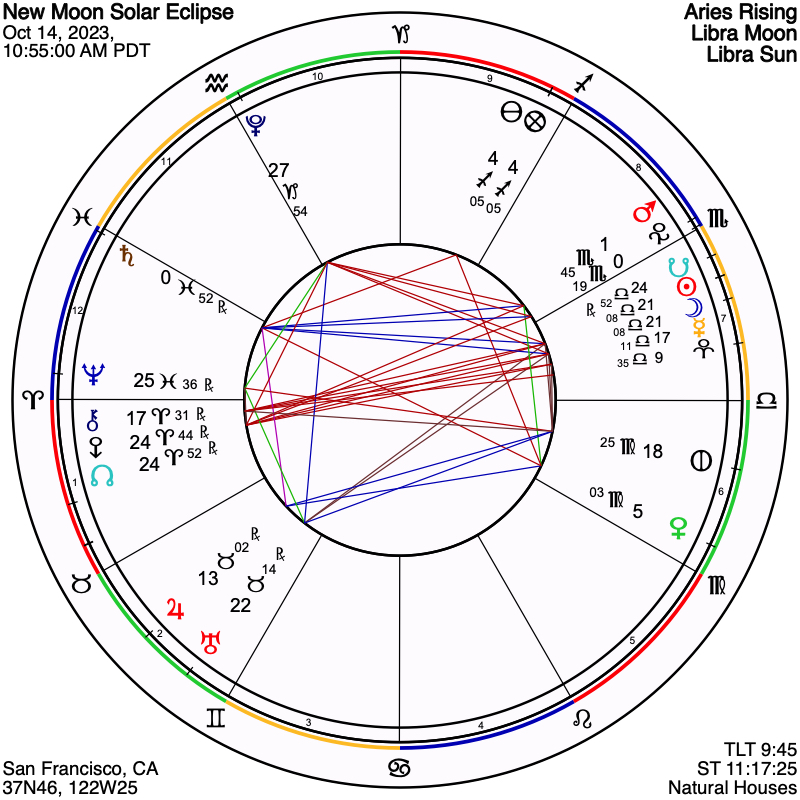 Saturday morning’s Solar Eclipse in Libra, taking place at 10:55 am PT, later in the day for the east coast and Europe, is a very special lunation. Not only is this New Moon an eclipse, with effects that are said to last six months, but there is a remarkable presence of Eris, Feminine Warrior for soul intention, that goes to depth within the psyche, just as Pluto does, and that encourages us to find our deepest values and act upon these as we make our way forward. Transformational Pluto has been featured in recent New Moon configurations, and in this case is square to Mars, and to Haumea, the new 21st century Nature planet that also speaks to inner moral compass. Of course, it need not be said that these are extremely difficult times on planet Earth, with two unrelentingly ugly wars now that have no easy resolution in sight. More than ever, we need to find within ourselves the courage, and moreover the faith in the Universe, in ourselves, and in our process, to go on. Another planetary archetype, that of the Trickster, Uranus, has also been extremely prominent in recent New Moon configurations, and is in this case as well, being in a close quincunx aspect to the Sun and Moon. The relevance to this fall period is that unexpected events are in the works, as we tragically saw last weekend, and yet also the potential for innovative solutions to arise to meet the new challenges. As Einstein famously remarked, we cannot solve whatever problem we face by the same assumptions that got us into it in the first place; so that it is high time for novel approaches to what we are dealing with as a global society.