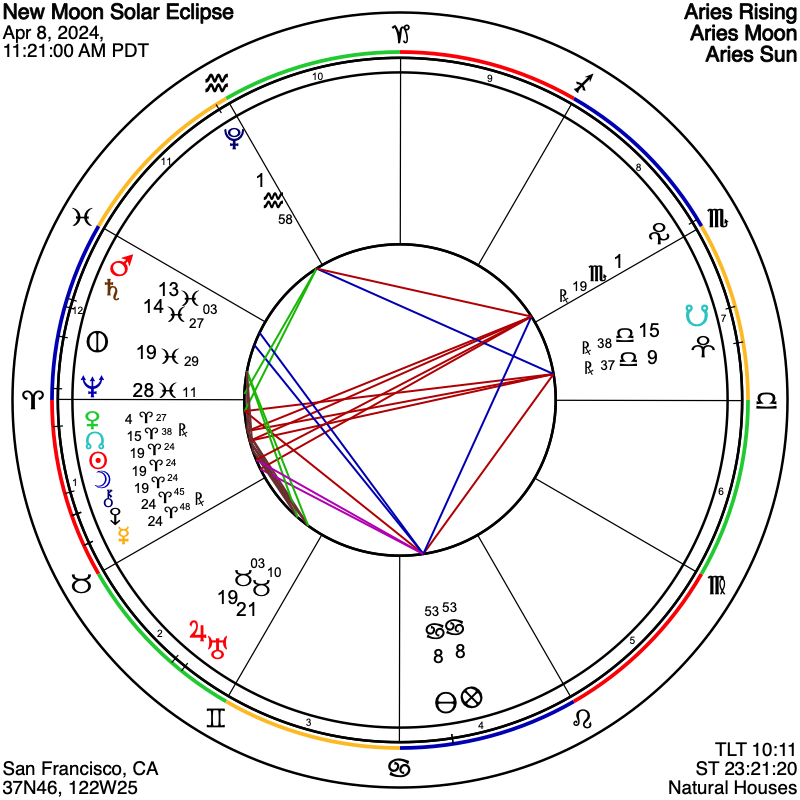 Monday morning’s New Moon and Solar Eclipse at 19 Aries, taking place at 11:21 am PT, is a fascinating and extremely potent lunation. For starters, Mars is conjunct Saturn, signifying a slow-down, and Mercury is retrograde, and highlighted, bringing the introspection and the reconsiderations of this off-kilter period of time even more closely to our attention. In another strong factor of the eclipse configuration, Uranus and Jupiter are nearing conjunction also, 2° separating them, centered on the 20-degree mark of Taurus. The implication there is of unexpected events or surprise enlightenment coming to the fore, and perhaps in a highly positive or optimistic manner, thus potentially offsetting any potentially negative impact. In addition, and the cherry on top, if cherry is the word I want, is the extremely highlighted presence of Chiron, the Wounded Healer in this eclipse. We find the Sun and Moon at 19°24’ of Aries, with Chiron at precisely 19°24’ of the same sign, thus matching the eclipse degree to the very minute in an extremely rare alignment.