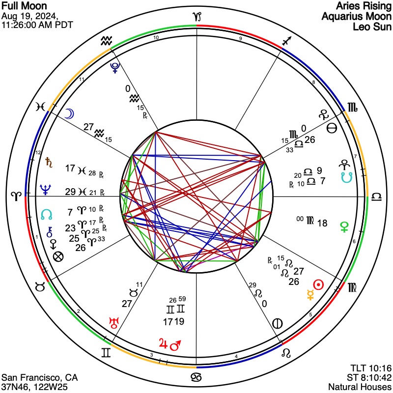 The Aquarius Full Moon that takes place on Monday, August 19th, at 11:26 am PT, and located at 27° of Aquarius with the Sun opposed at 27° of Leo, graces our inner skies with two very active T-squares: to Uranus, and to Jupiter-Mars, making for a big touchdown of a lunation configuration. That Uranus is also slowing down in its geocentric movement, stationing to retrograde motion on September 1st, and that its position in this Full Moon is 27° of Taurus, precisely squared by Sun and Moon, enhances his highlighted presence. When we think of amplified Uranus in Taurus, a sign that he is somewhat antithetical to, we think of surprises; strange events out of “left field” that might startle us into greater archetypal consciousness. Uranus, after all, as well as referencing mystical planes of existence beyond the physical, does rule astrology. Uranus is also characterized by synchronicity, which seminal psychological thinker C. G. Jung defined as an “acausal connection’ between seemingly unrelated events, such as a flock of birds over a death house. This references as well a planetary alignment corresponding to the qualities of an individual born under that sky along the lines of that famous dictum “as above, so below.”