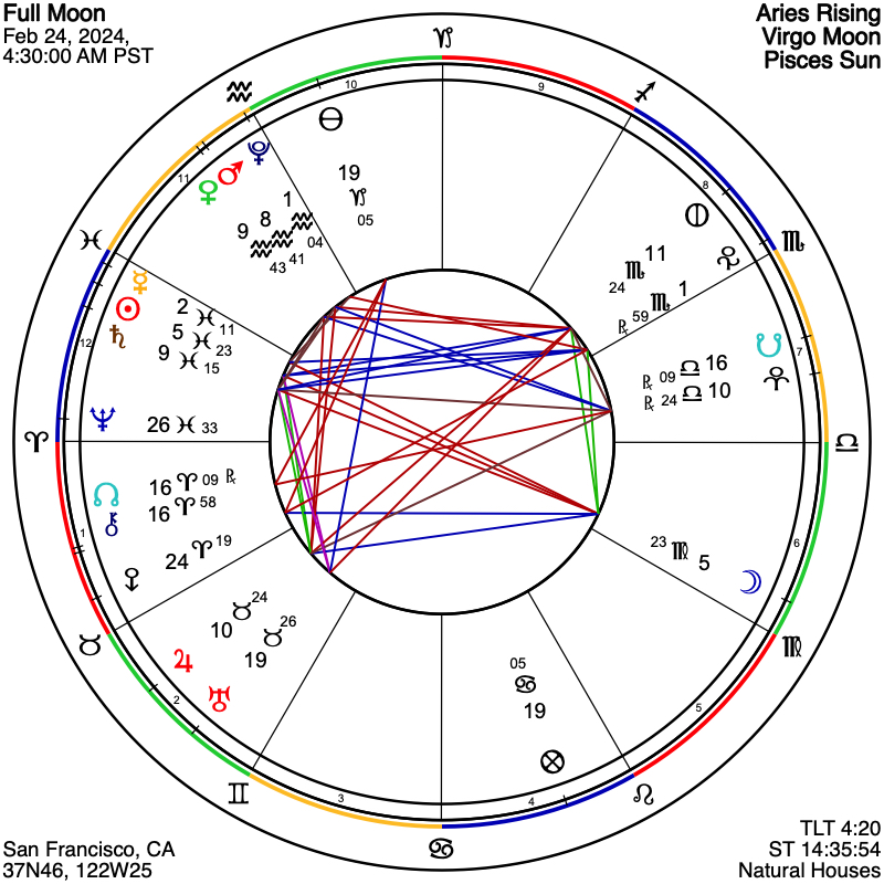 The Full Moon reaches its culmination on Saturday, February 24th at 4:30 am PT. Positioned in opposition to the Sun as it transits through Pisces, the Moon at 5º Virgo sheds light on our awareness of the ethereal and unseen as it intertwines with more tangible and mundane experiences. Virgo, a mutable Earth sign ruled by Mercury, possesses both a grounded and fluctuating quality, with a meticulous inclination for analysis deeply concerned with how the smallest details can impact the greater whole. This is one theme that we might see playing out over the next two weeks of the remainder of this Aquarius lunation cycle. Mercury and Saturn are also both in close proximity to the Sun in this Full Moon configuration, with their midpoint in the 5 degree mark of Pisces, the same as the Sun in this Full Moon, indicating a review that could be coming up for the mental constructs and beliefs that shape our reality. Additionally, a grand trine in Earth between the Moon, Jupiter, and the asteroid Ceres offers important insights into finding expansive states of being that support, nourish, and soothe our hearts and souls.