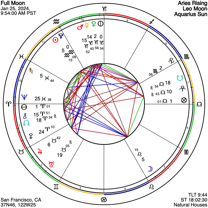 The Full Moon in Leo taking place on January 25th at 9:54 am, PT, later of course for points east, is an extremely potent lunation that echoes themes for the entire year. The Full Moon configuration features a grand cross in Fixed Signs between Sun and Moon in opposition, squared by Jupiter in Taurus on one side, and the new Nature planet Haumea in early Scorpio on the other. The Sun at 5° of Aquarius remains fairly close to Pluto at 0°, and their midpoint of 2 ½ Aquarius is in a same-degree square with Haumea, while the Jupiter position of 6° Taurus is only one degree away from the Sun and Moon, so that the aspects making up the grand cross are all quite close! With that prominent placement of Jupiter, the symbolism suggests a trend toward optimism plus the accompanying caution not to go too far, too fast, as echoed by a highlighted Saturn, coupled with the potential indicated by Haumea of further exploring our connection – as we further progress in discovering our true life path – to to our own internal principles and values, and to Nature herself. This is an action-oriented Full Moon that signals a strong impact on our lives as, in the midst of the fragmented societal crisis of this decade, we struggle both personally and culturally to evolve.