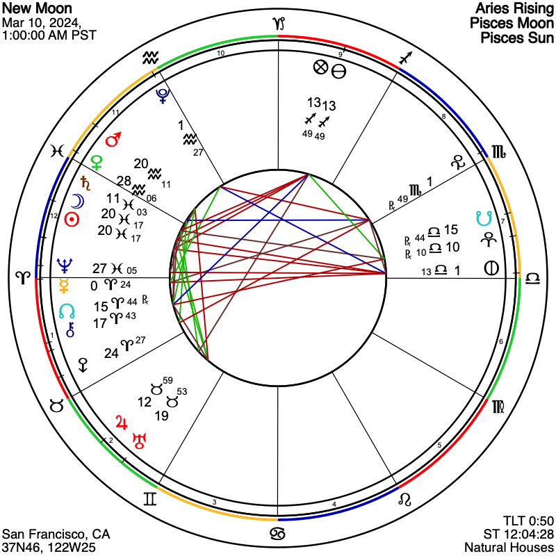 The Pisces New Moon taking place early Sunday morning, at 1 am PST, a few hours later for points east, has many and varied effects – all of them powerfully interesting. We have, for one thing, a very strong Mars-Uranus square supported by the Sun and Moon, which presages surprise events and impulses, with the potential for new beginnings of an unusual kind. Then, too, there is all the Neptune in this New Moon, and in the cycle to follow, with Neptune conjunct the Sun, while the Moon’s First Quarter takes place a week later with the Sun in partile conjunction with the Neptune position of 27° Pisces, and the Moon in square. In this New Moon configuration as well, Mercury has just entered Aries, so residing at the 0° mark, and is therefore not only in conjunction with Neptune but also sextile with transformational Pluto at 1° of Aquarius. With Neptune involved, there can be fantasy or over-idealization, as well as just plain deception in the working out of our thoughts and schemes. This Mercury double aspect also encourages us to be as aware as possible of the spiritual dimension of ordinary life, as well as to question our assumptions. There might actually be something going on with your thought process or the way you perceive the world around you that is in need of adjustment, and with so much Uranus in the picture of this New Moon as well, there may be a nudge from the universe telling you an unusual message that you will need to hear, so that it pays to be alert for it.