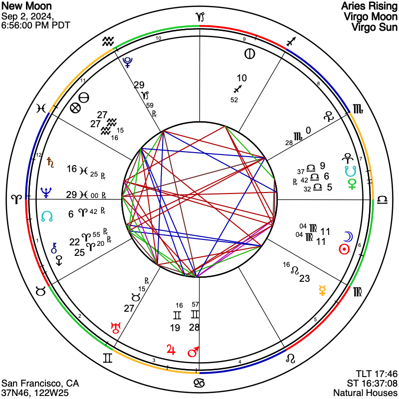 The Virgo New Moon of September 2nd marks an energetic shift in this late 2024 timing, occurring at 6:56 p.m. PT and at 11º04' of the sign. This New Moon arrives on the tail of some wild astrology, as the past month brought some of the most intense and transformative transits of the year, including the hefty exact hit of Saturn square Jupiter and Mars, and a Mercury Retrograde through Virgo and Leo. All of this has created massive waves, both collectively and individually. Aspirations were met with the hard terms of reality, and practical transformations and adjustments were required to build the resilience needed to keep moving forward. As this new lunar cycle commences, the Saturn-Jupiter square is beginning to fade, and Mercury is starting to straighten out, having stationed direct on August 28th. This New Moon configuration offers the practical wisdom of Virgo through the soli-lunar principle, inviting us to integrate the lessons of the previous cycle into new seeds of intention to draw us forward. Pluto has recently re-entered Capricorn for its final chapter there until mid-November, when it will finally return to Aquarius for the next 20+ years. Mars in inconjunct (quincunx) aspect to this Pluto position reminds us that we are subject to high passion, perhaps including fits of anger. During this coming month, where the rubber meets the road in terms of pursuing our goals and fulfilling our unique purpose and passion, we are invited to clarify our core values, simplify our approaches, and foster adaptability in the face of the rapidly transforming landscape of our world.