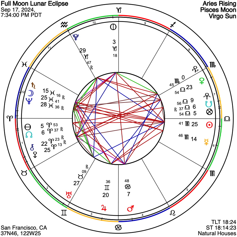 Tuesday’s Pisces Full Moon, which is also a partial lunar eclipse, takes place on the evening of September 17th, at 7:34 pm PT, a few hours later for the east coast and Europe; and features no fewer than three major oppositions. There is of course the Sun opposed to the Moon, exact at 25° 41’ of their respective signs of Virgo and Pisces, and as well Mercury at 14° Virgo opposed to Saturn at 15° Pisces. Additionally, we find Venus at 23° 54’ of Libra opposed to the Chiron/ Eris midpoint at 23° 47’ Aries, exact to within 7 minutes of a degree. The Mercury-Saturn opposition, emphasizing the theme of contraction and serious thought forms, is tempered by a T-square from Sun and Moon to expansive Jupiter, located at 20° of Gemini, and exactly square the Mercury/Sun midpoint. Jupiter is also closely trine to Chiron at 22° of Aries. All in all, as we face an uncertain future with fear or with hope, we will have the tendency to suffer from outdated beliefs and attitudes that may have need of adjustment before our better angels can rise to the occasion, as we can come to that.