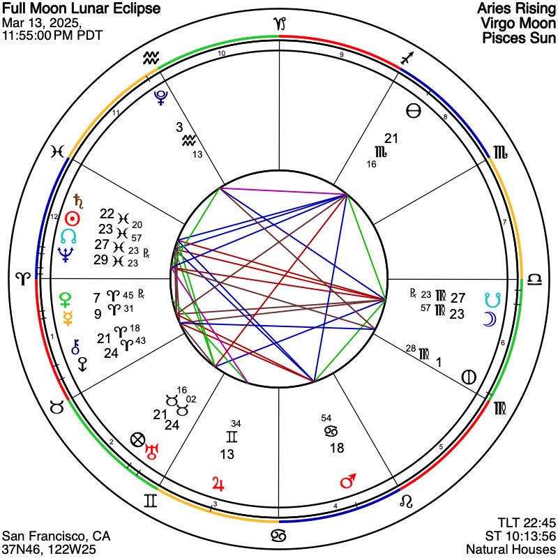 The Virgo Full Moon and lunar eclipse transpires on the late evening March 13th, taking place at 11:55 pm on the west coast, PT, or early morning on the 14th for other time zones farther east. In this eclipse Full Moon configuration, the Sun is conjunct limiting and contractive Saturn, which slows us down and yet is good for lasting lessons, while Uranus is also highlighted, being in close trine to the Virgo Moon, and closely sextile the Pisces Sun. The eclipse Moon and Sun also aspect Eris at 24° of Aries. Meanwhile, Mercury is standing almost dead still in the sky, preparing to station retrograde just 24 hours past the midnight timing of this March 14th Full Moon, while Venus is also moving backward through early Aries. And as well, among outer planets correspondences, the Sun is closely septile to Pluto in early Aquarius, while numinous Neptune is parallel both Sun and Eris. All in all, this is quite a heady stew of outer planet activations, as well as inner planet retrogrades, along with an extremely potent Full Moon energy due to it being a total lunar eclipse.