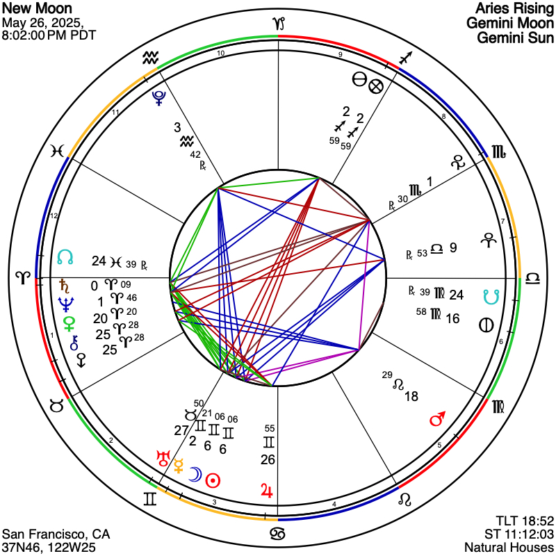 Monday’s Gemini New Moon at 6° of the sign takes place in the evening, May 26th, at 8:02 pm PT, several hours later for the east coast and early morning next day for Europe and points east. One theme of the New Moon, in Gemini and with Gemini’s ruler, Mercury, at 2° Gemini, thus in a 4-degree conjunction, is communication, information, curiosity, and learning – and with much of the received information coming from intuitional sources within. The transformative energies of Pluto are also highlighted in this New Moon, with Pluto at 3° of Aquarius being trined by Mercury and the New Moon, sextiled by Saturn-Neptune, squared by the new 21st century nature planet Haumea, and lying in parallel to Jupiter. Dealings are challenging, and changing, and discernment is required to see things through to the most wholistic outcome. Partnerships are also a significant component of this New Moon, and of the events of the June month that follows, because both Venus and Mars are closely aspected by the New Moon and are trine each other, from Aries to Leo. For another important aspectual combination, Saturn, newly entered into Aries, is closely conjunct Neptune, which gains intensity through the summer months, before easing off a bit in the fall. This is all quite powerful, and echoes the polarities that we see all around us in the current zeitgeist and individually. More on these crucial aspects below.