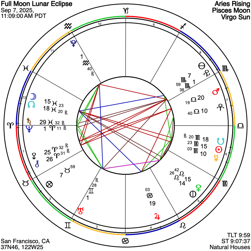 It is striking, too, that while the eclipse axis itself does not connect by direct aspect to the outer planets, it’s significant that all of these — Uranus, Neptune, and Pluto — are currently perched at 1º of their respective signs in very close alignment with each other, as was featured in the recent Virgo New Moon at 0° of the sign — and of several recent New Moon configurations. This is a highly unusual pattern, signaling that we are inhabiting an entirely new cosmic landscape. This lunar eclipse is the first eclipse to occur in this terrain, marking it as a threshold moment. Uranus and Neptune will step back into their previous signs by the end of the year, only to return to these new placements in 2026. All of this signals that we are in the midst of one of the great turning points of our lifetime.