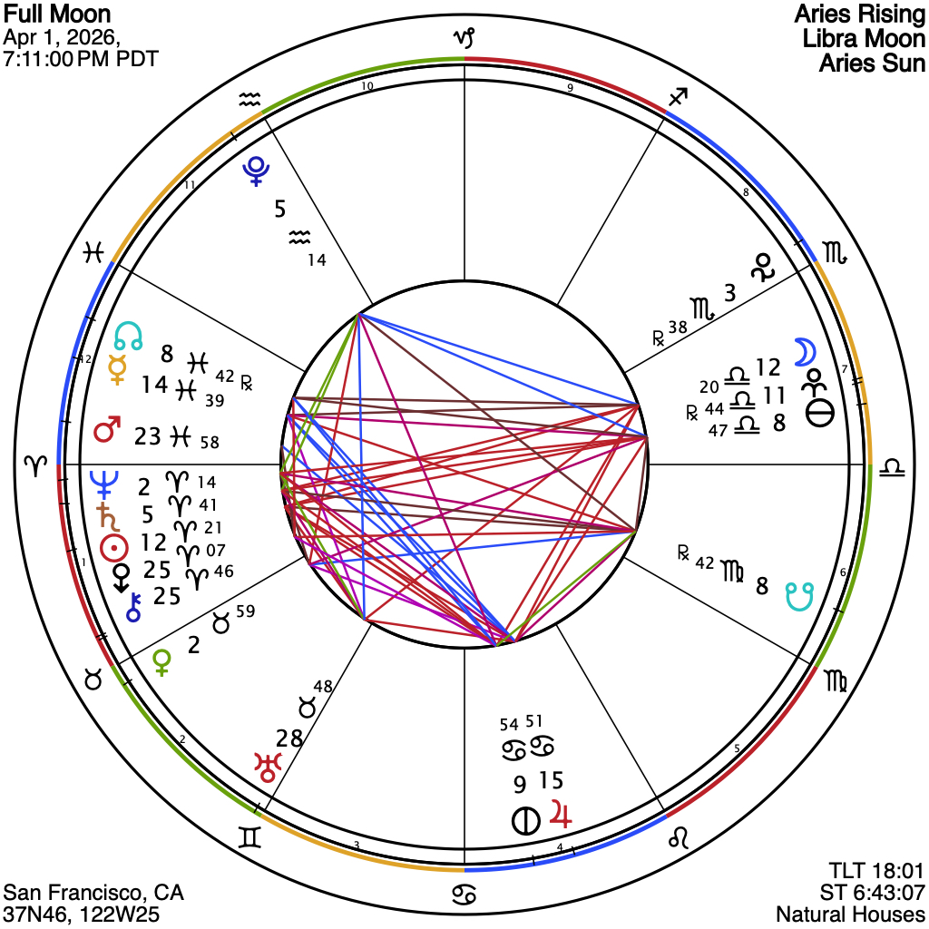 The Full Moon in Libra arrives on April 1st, 2026, exact at 7:11 PM Pacific Time, at 12°20′ of the sign. This lunation illuminates all things Libra: the connective and relational dimension of being, the ways we seek and reach for a sense of equilibrium, balance, and justice. These are not static or fixed states of being, but an ongoing conversation with ourselves, with each other, and with the larger forces of life. As always at the Full Moon, we find the Sun in opposition, here in the sign of Aries, where a fresh and vital energy enlivens our shared ethers with its characteristic boldness and forward momentum. This Aries-Libra axis naturally brings the polarity of self and other into relief, asking each of us to extend beyond our own view or perspective and remain genuinely open to approaches and ways of being that may differ from our own.